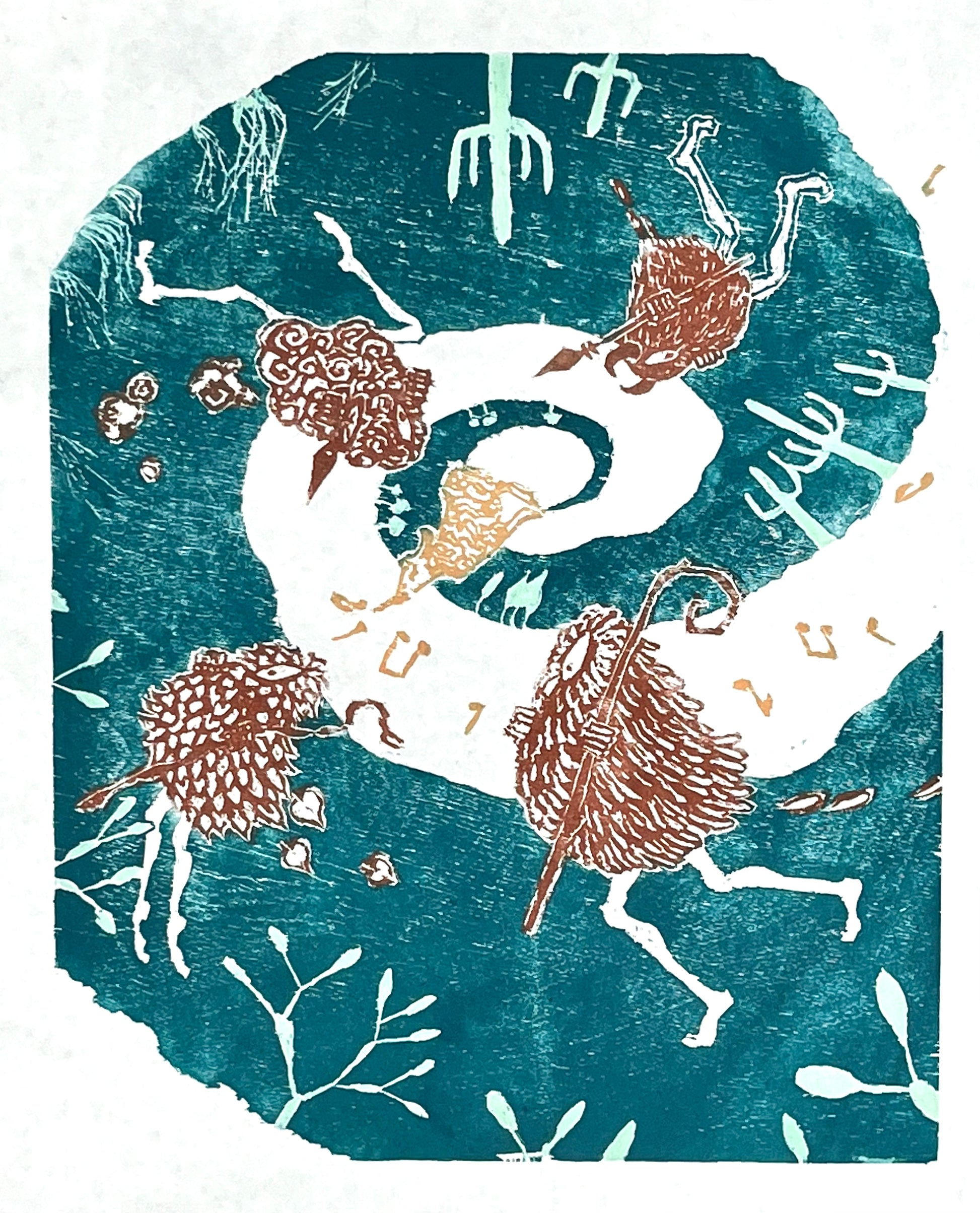 This is a limited edition woodcut print; only 5 will be printed with this color combination. It is printed on Masa paper and measures approximately 15inches wide by 18 inches tall. Materials include Akua Ink and pastels.