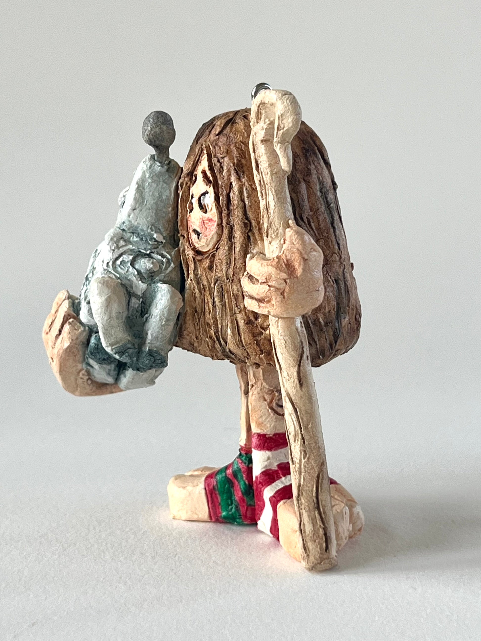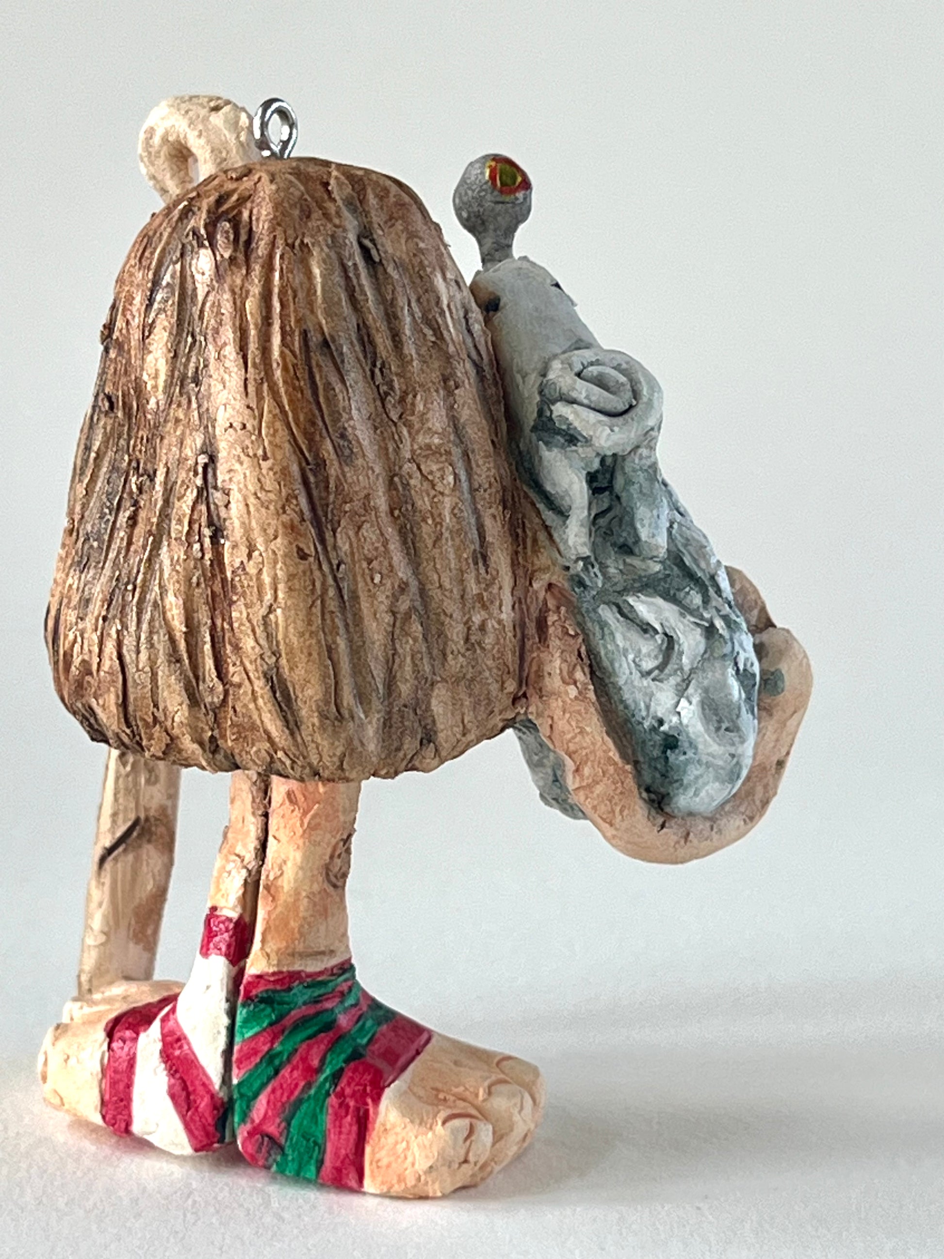 Hand sculpted and painted bisqueware ornament. Since this piece is hand sculpted and painted, it is one of a kind. The piece is sealed, but it is not recommended for outdoor use. The ornament is not meant to stand on its feet as it is unstable. Wire hanging hook included.