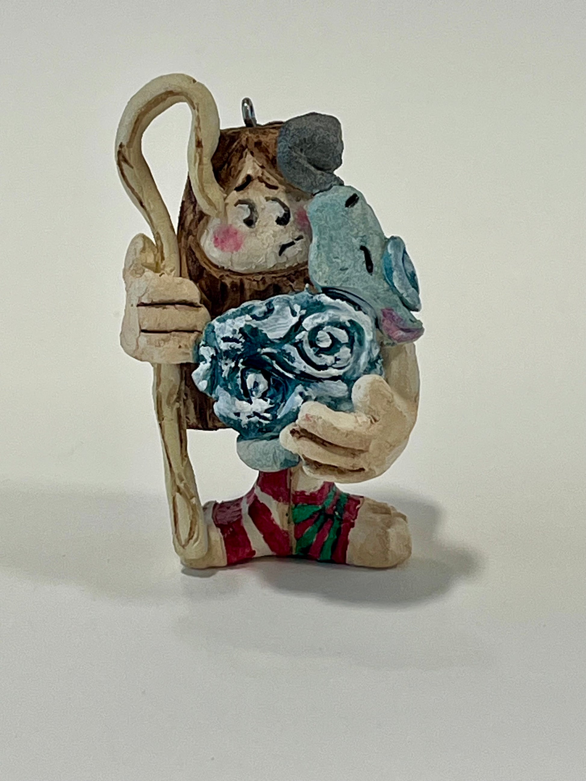 Hand sculpted and painted bisqueware ornament. Since this piece is hand sculpted and painted, it is one of a kind. The piece is sealed, but it is not recommended for outdoor use. The ornament is not meant to stand on its feet as it is unstable. Wire hanging hook included.