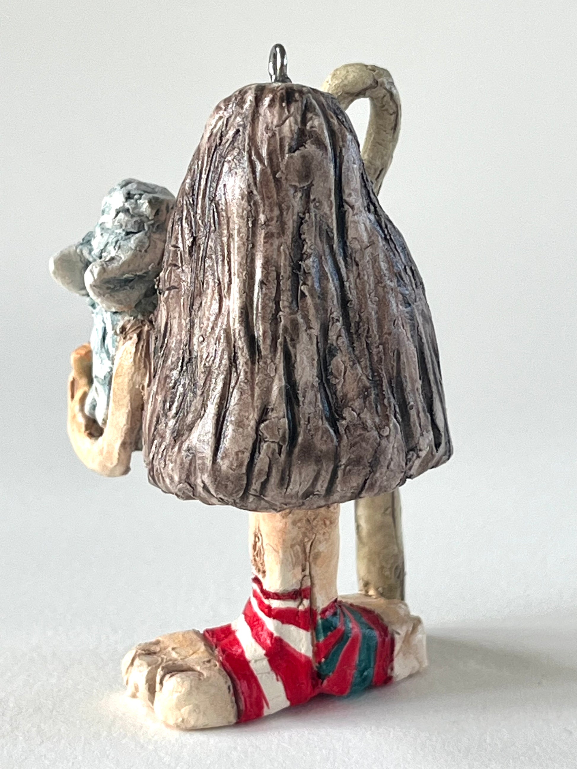 Hand sculpted and painted bisqueware ornament. Since this piece is hand sculpted and painted, it is one of a kind. The piece is sealed, but it is not recommended for outdoor use. The ornament is not meant to stand on its feet as it is unstable. Wire hanging hook included.