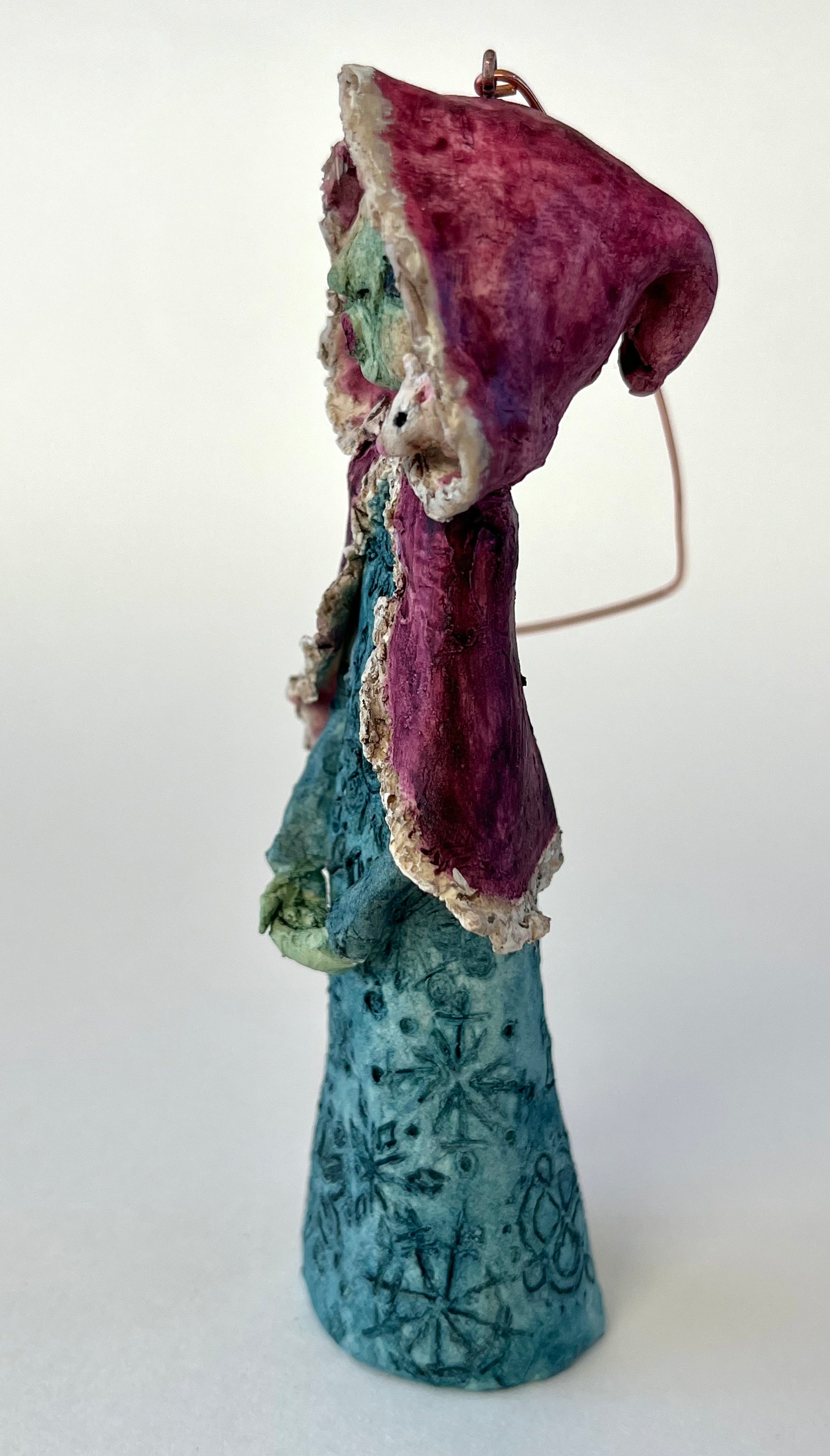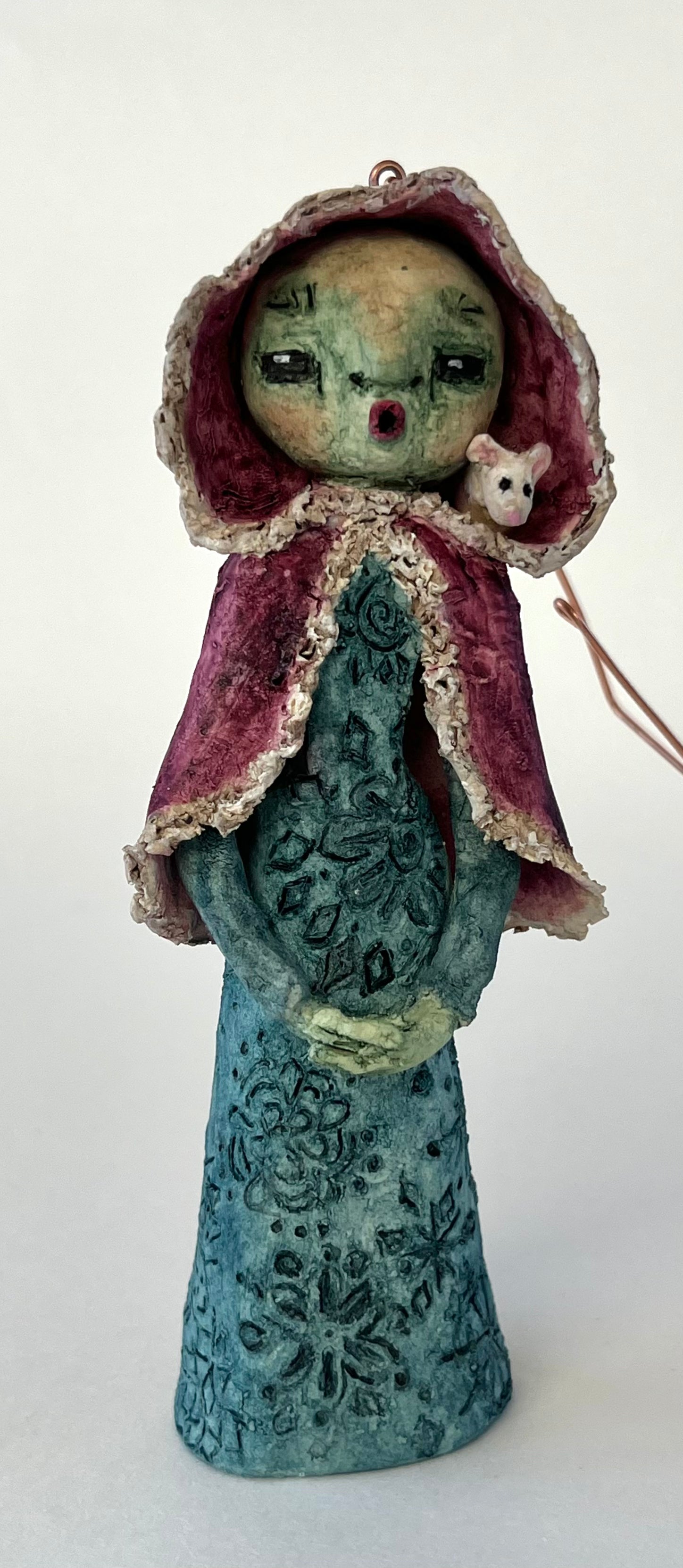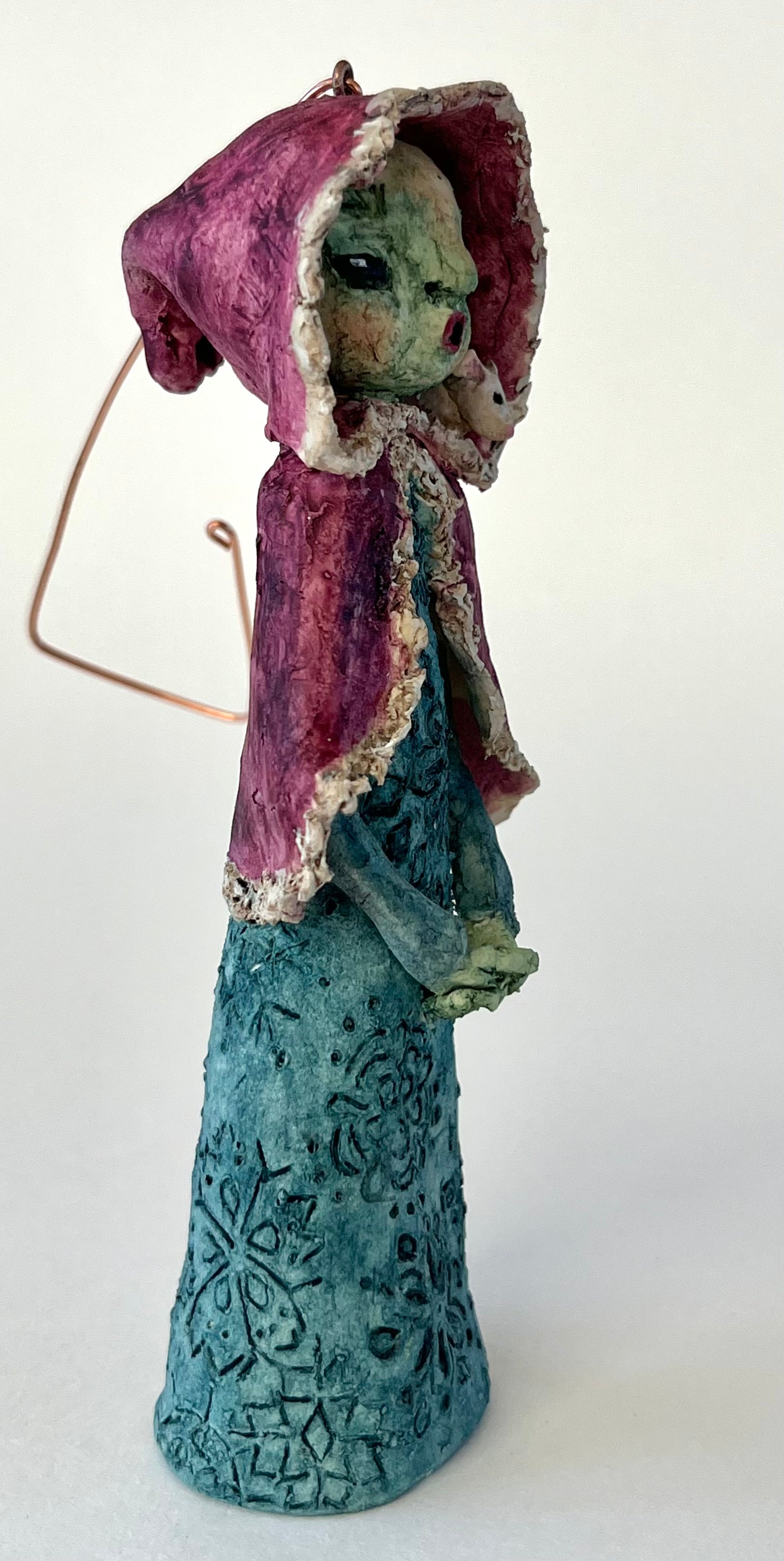 Hand sculpted and painted bisqueware ornament. Since this piece is hand sculpted, it is one of a kind. The piece is sealed, but it is not recommended for outdoor use. Copper wire hook included.